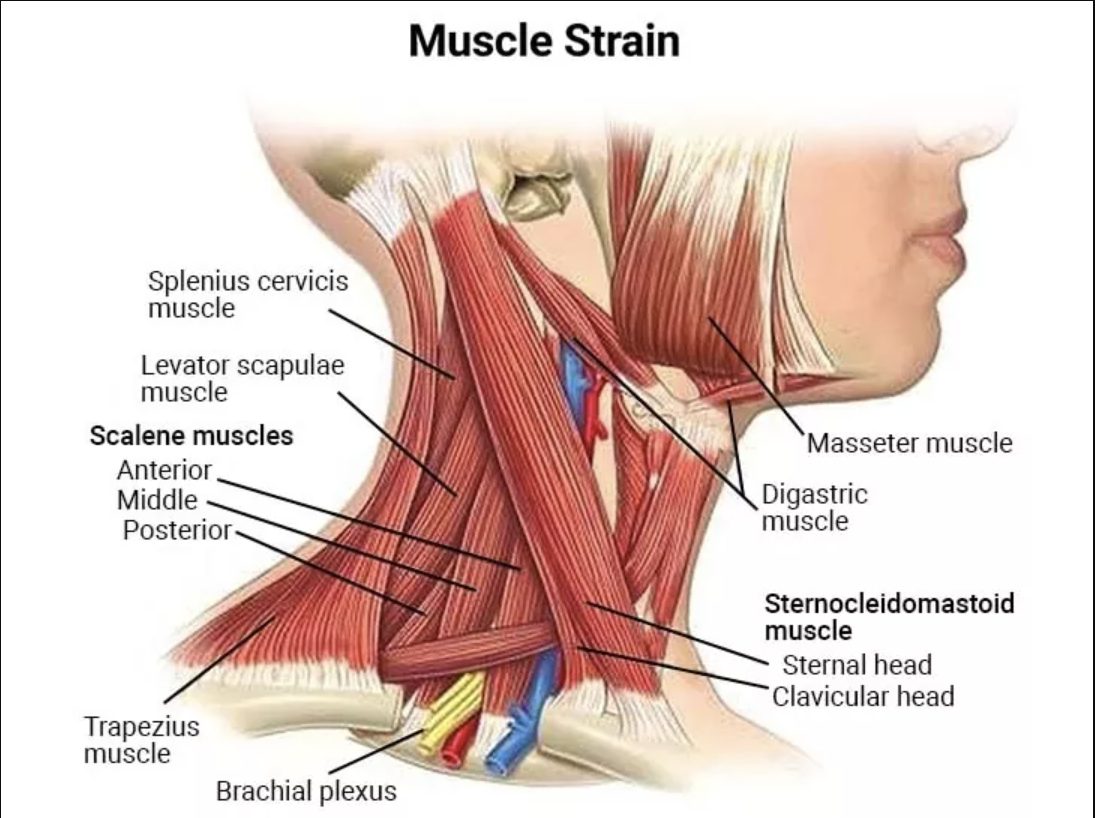 Note: Also the yellow nerves poking through the scalene muscles near the bottom of the photo. When these muscles are tight, they can compress the nerves causing numbness and tingling into the arm and hand. These symptoms are often diagnosed as thoracic outlet syndrome or cervical radiculopathy.